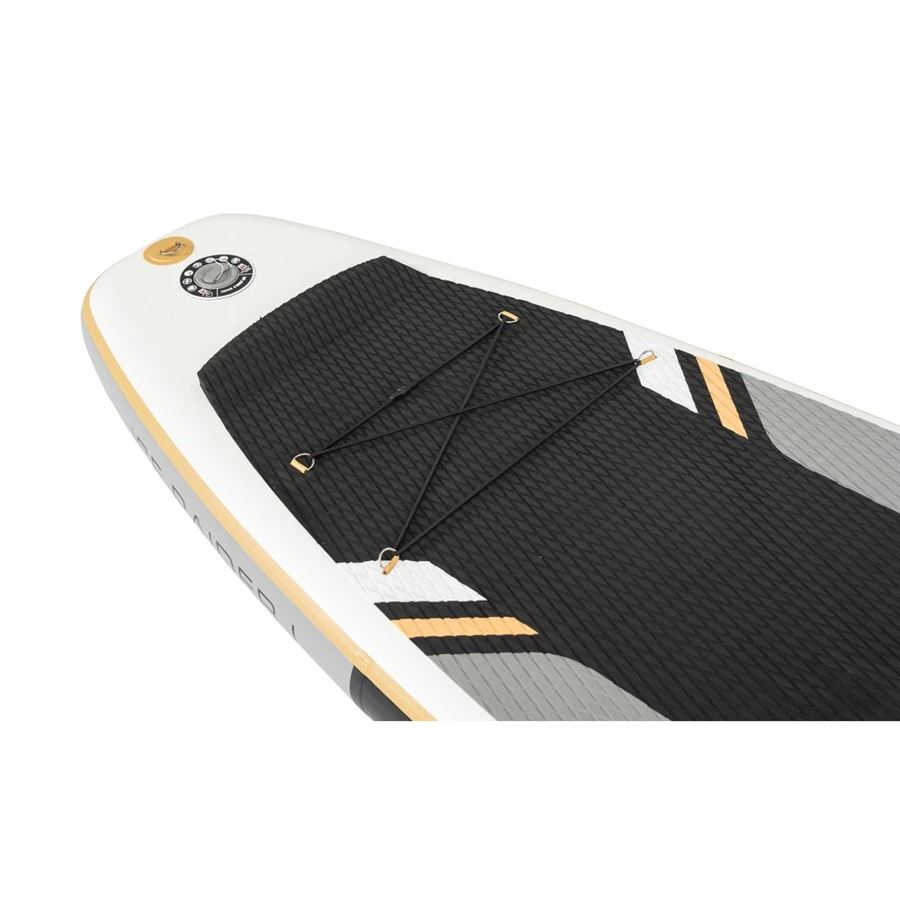 je ideální volbou pro začátečníky i pokročilé jezdce, kteří hledají spolehlivý paddleboard na klidné vodní plochy. Užijte si jízdu vestoje i vsedě a mějte vše potřebné po ruce – ať už vyrážíte za relaxem nebo sportovním zážitkem.