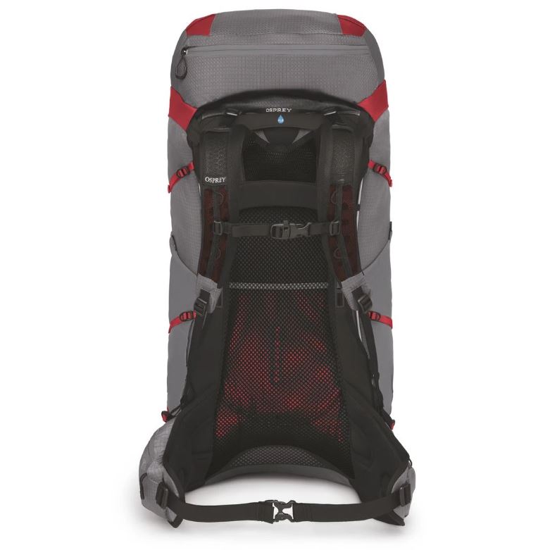 , FlapJacket pro přístup do hlavní komory a také pro ochranu před povětrnostními vlivy, vnitřní přihrádku na vodní rezervoár i středový zadní otvor pro hadičku a sponou Osprey Hydraclip pro snadnější zavěšení rezervoáru.