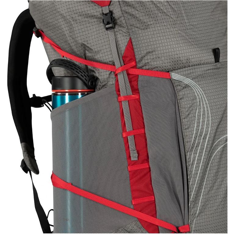 , například pro uchycení spaní podložky na předním panelu. Pro upevnění dalšího vybavení zde naleznete několik úchytných bodů na předním panelu, hluboké boční kapsy ze strečové síťoviny s dvojitým přístupem a dvojitá poutka na cepíny s rukojetí.