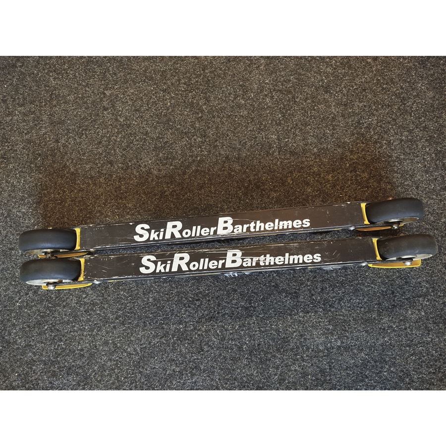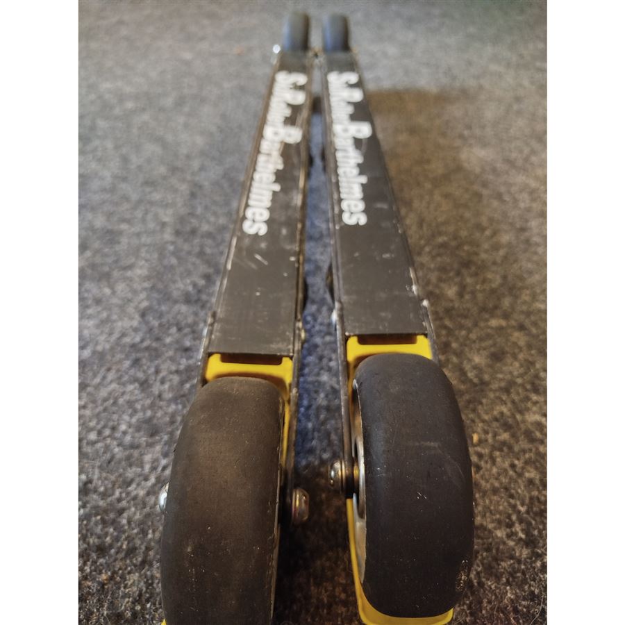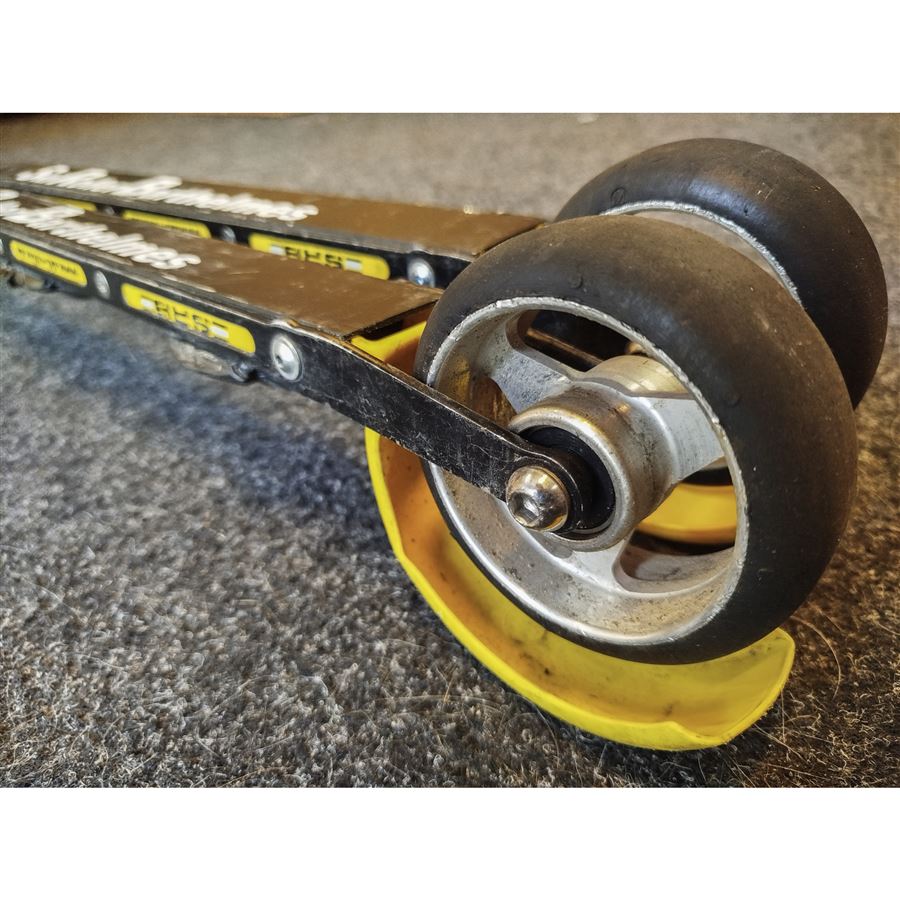 Spodní strana lyží má větší množství drobných odřenin. Kolečka mají dle odhadu ještě 70% životnosti. Technicky plně funkční.