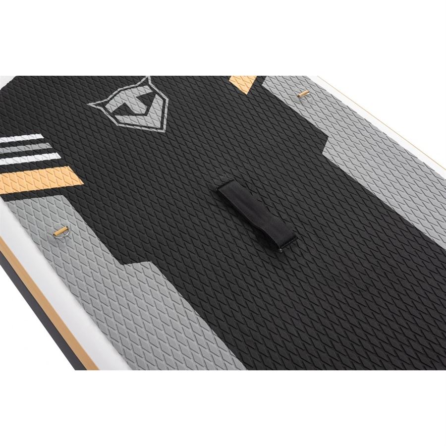 Prémiová konstrukce je založena na dvojvrstvé laminaci DROP-STITCH 2550 g/m², která zaručuje vysokou pevnost a odolnost. Materiál tvoří čtyřvrstvé PVC v kombinaci s pětivrstvou tkaninou 1000D, která je vyrobena technologií oboustranného křížového spojování. Díky technologii Wire Drawing s karbonovými vlákny má konstrukce vynikající stabilitu, nosnost a dlouhou životnost.